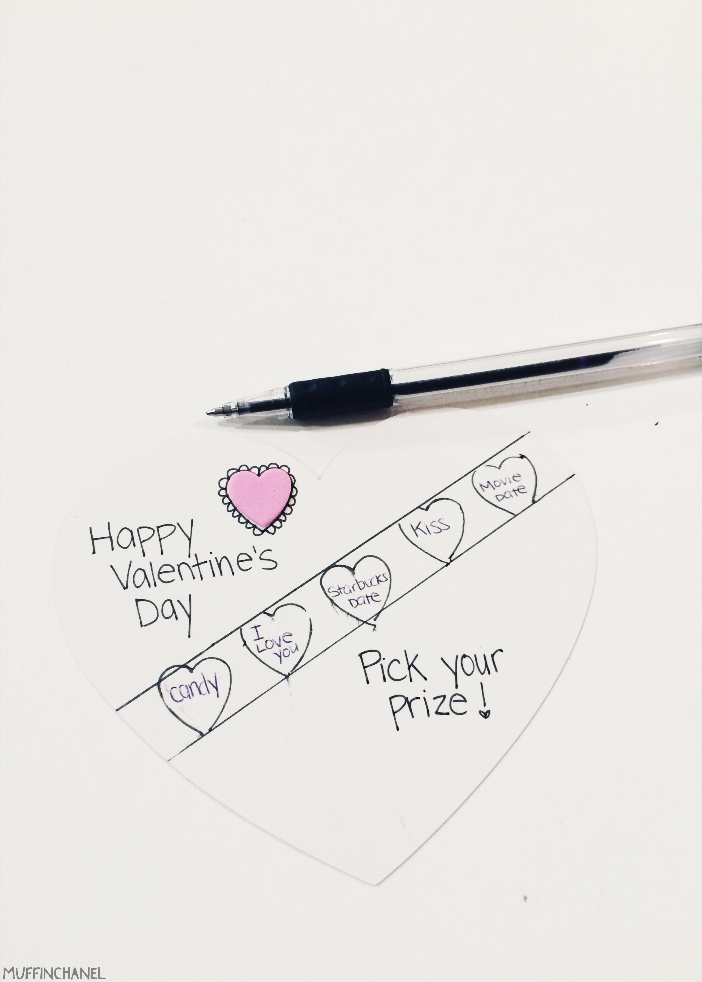 Then, just write in whatever cute Valentine’s Day prizes you want for your scratch off ticket. I wrote things like “Starbucks Date”, “Kiss”, and “Candy”.