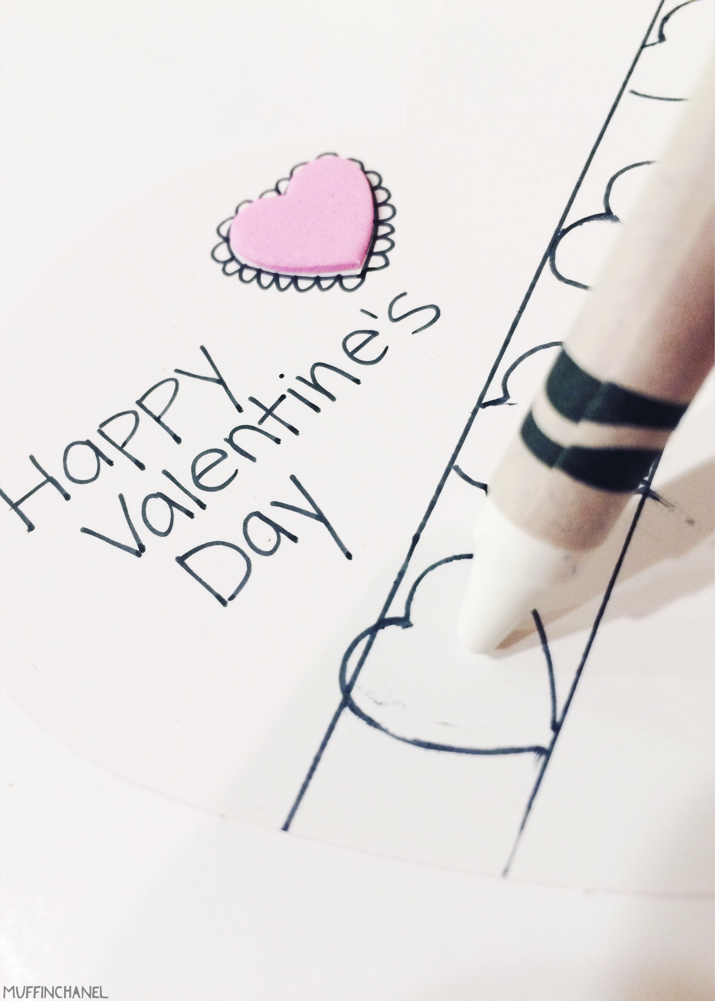 Next, just fill in each heart with white crayon. Use a lot. I actually forgot to use the crayon on the first card I tried, and the crayon is definitely needed if you want the paint to scratch off!