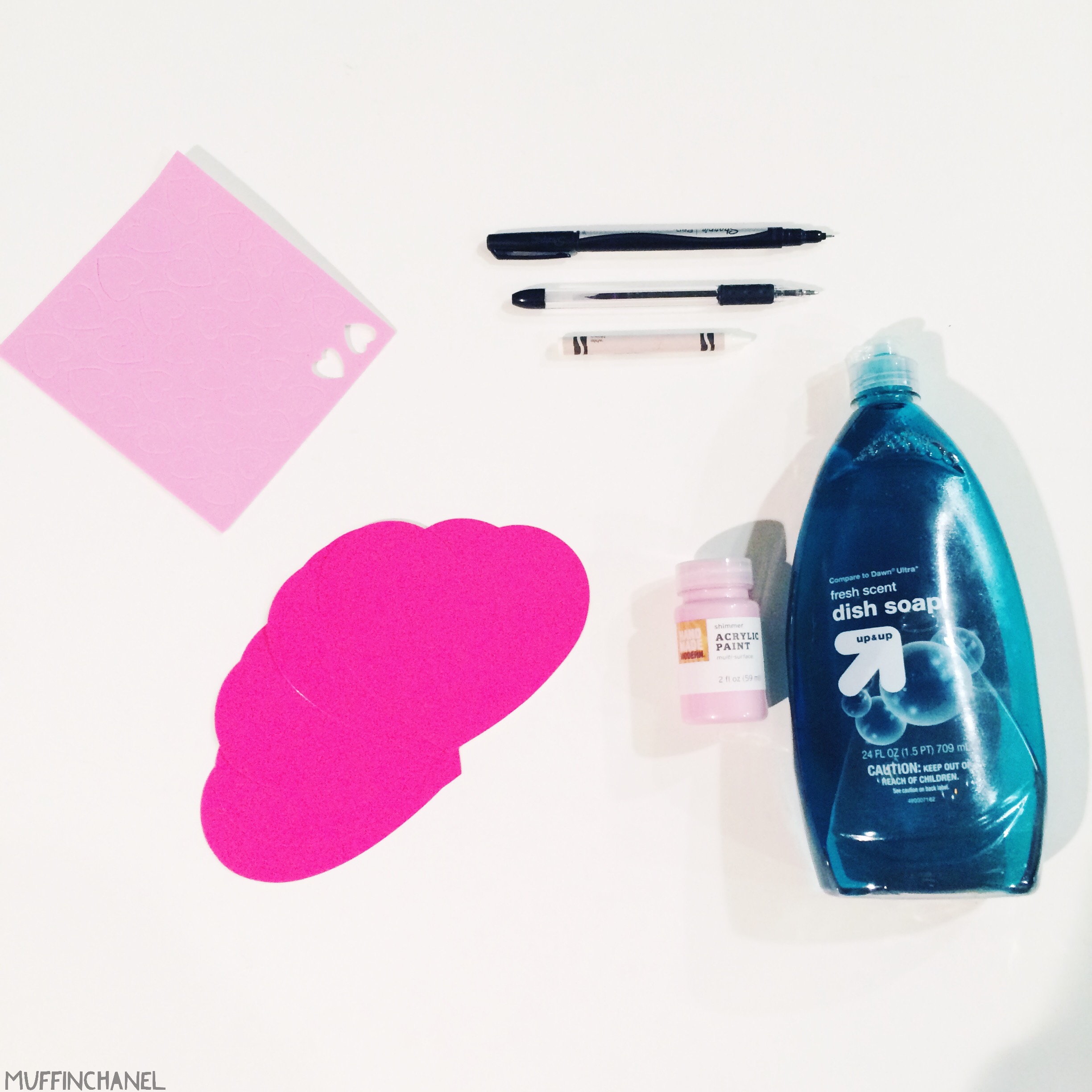 Create your Valentine’s Day scratch off pain by mixing 1 parts dish soap to two parts paint. So, I just used 1 tsp. dish soap and 2 tsp of the acrylic paint.