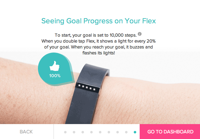 Each light on your Flex tracker represents 20% of your goal. When you reach your goal, Flex will buzz and flash in celebration of your achievement.